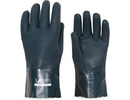 Luva de segurança confeccionada em suporte têxtil de fibras naturais, revestimento externo em policloreto de vinila (PVC) e acabamento antiderrapante arenosa, na região palmar, ponta dos dedos e no dorso.